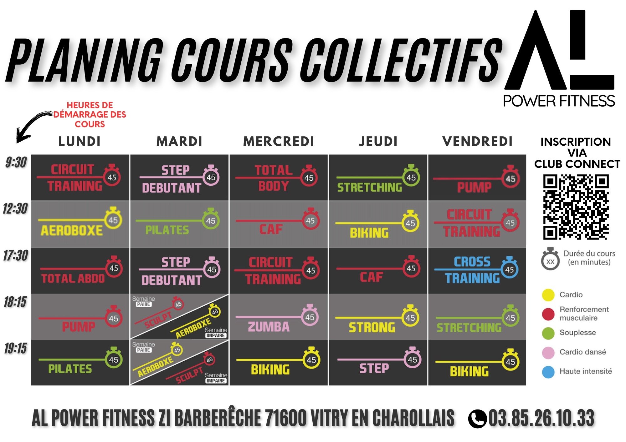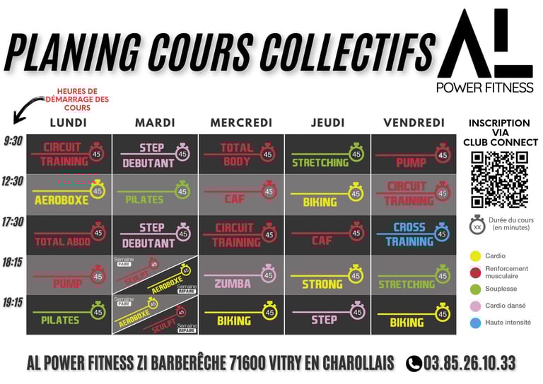 Découvrez nos cours collectifs et leur planning à notre adresse. Rejoignez-nous pour des sessions enrichissantes et motivantes.